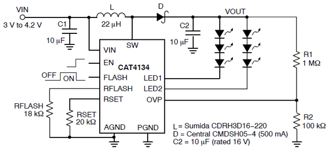 以CAT4134為例,這是一款大功率電感升壓型雙通道驅(qū)動轉(zhuǎn)換器,提供2路匹配的LED電流。輸出電流級別通過2個電阻之一RSET或RFLASH來控制。當(dāng)FLASH輸入引腳為低(電影模式),電阻RFLASH設(shè)置LED電流。每個通道驅(qū)動2或3個白色串聯(lián)LED,并提供1個可調(diào)節(jié)電流以控制其亮度。支持輸入電壓低至3V,使得器件適合于鋰離子電池的應(yīng)用。
