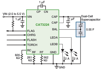 電荷泵型驅(qū)動器CAT3224也適合相機閃光應(yīng)用,從而支持高百萬像素相機閃光,以及替代氙氣閃光,配合纖薄設(shè)計。CAT3224是業(yè)界首款4 A單芯片超級電容LED驅(qū)動器,集成了雙模1x/2x電荷泵,提供三項關(guān)鍵功能:精密的超級電容充電控制、電流放電至LED閃光的管理,以及為LED手電筒模式提供恒流。這三種模式的工作電流均可以3個外部電阻來簡易編程,提供達4 A的LED閃光脈沖電流。超級電容技術(shù)的高峰值電流優(yōu)勢,結(jié)合CAT3224簡單的并行邏輯接口,使該器件非常適用于采用LED替代氙氣燈的應(yīng)用。