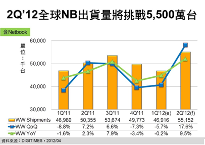 2012年第1季全球NB出貨淡季不淡,所反映的全產(chǎn)業(yè)復(fù)蘇跡象,DIGITIMES Research資深分析師兼主任簡佩萍預(yù)估,將延續(xù)至第2季,并展現(xiàn)更強(qiáng)勁的反彈,季成長幅度將達(dá)17.6%,年成長率也將達(dá)近2年高點(diǎn),為9.5%,單季出貨量則預(yù)估可挑戰(zhàn)5,500萬臺新高。