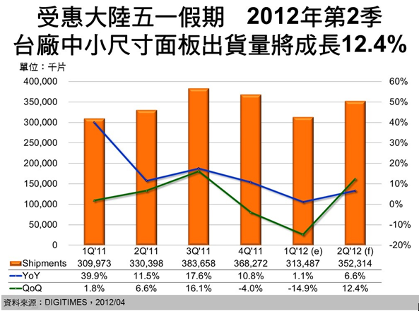 第2季為中小尺寸TFT LCD面板傳統(tǒng)旺季的開始,其中,大陸五一假期需求更是第2季的主要市場動力來源,DIGITIMES Research分析師楊仁杰分析,2012年第2季臺廠中小尺寸TFT LCD出貨量預(yù)估將為3.52億片,將較前季成長12.4%。至于年成長率,則受惠大陸手機(jī)市場,尤其是智能型手機(jī)市場帶動,加上臺廠打入國際大廠7吋平板裝置、教育學(xué)習(xí)機(jī)、打印機(jī)等應(yīng)用,將較2011年第2季成長6.6%。