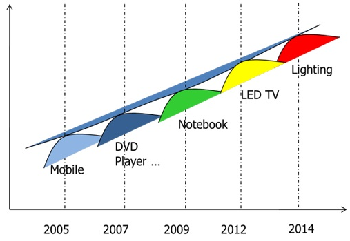 綜觀LED的發(fā)展過程,2002年起LED從小尺寸顯示器(主要應(yīng)用在手機(jī)上)開始滲透,在2005年達(dá)到高峰。但是隨著效率的提升,單位顯示器使用的LED顆數(shù)也逐漸減少。當(dāng)手機(jī)成長(zhǎng)趨于飽和狀態(tài)下,LED總需求量便開始下滑。在此時(shí)LED便開始尋找下一個(gè)應(yīng)用:中尺寸顯示器。隨著性價(jià)比的不斷提升,LED于2007年在中尺寸顯示器的需求達(dá)到飽和,與先前小尺寸一樣LED需求開始往下。LED開始進(jìn)入到另一個(gè)應(yīng)用:筆記本電腦顯示器,并于2009年底開始進(jìn)入電視顯示器的應(yīng)用。隨著LED在大尺寸顯示器的廣泛應(yīng)用,LED的性能已經(jīng)提升到每瓦100流明以上,而價(jià)格也快速下降,此趨勢(shì)對(duì)于LED在照明應(yīng)用的發(fā)展有著無比的助力。