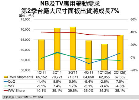 2012年第2季臺(tái)廠大尺寸(9寸以上)TFT LCD面板總出貨量將為6,735.2萬(wàn)片,較前一季增加7%,但較2011年同期則減少4.8%,DIGITIMES Research資深分析師兼副主任黃銘章分析,主要原因?yàn)椴示Ъ叭A映相繼地淡出大尺寸面板市場(chǎng),2011年華映的各類(lèi)NB面板出貨達(dá)到664萬(wàn)片,但2012年將降至不足100萬(wàn)片。因此,預(yù)期臺(tái)廠佔(zhàn)全球出貨量比重在第2季仍將微幅下跌0.1個(gè)百分點(diǎn)至35.1%。