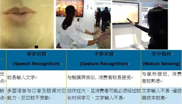 目前在許多電視機(jī)廠商與電視品牌的努力之下,已經(jīng)出現(xiàn)了三個(gè)通用的人機(jī)界面解決方案:語音識別 (Speech Recognition),手勢識別 (Gesture Recognition)和動作感應(yīng) (Motion Sensing)。每種方式均有其優(yōu)點(diǎn)和缺點(diǎn),簡單分列如下。