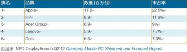 根據(jù)NPD DisplaySearch最新的季度Mobile PC出貨數(shù)量與預(yù)測報告初步調(diào)查結(jié)果,蘋果公司在2012年第一季出貨將近1,720萬臺Mobile PC,年成長率為118%。而約有80%的蘋果出貨來自iPad,第一季出貨量為1,360萬臺,年成長率達162%。