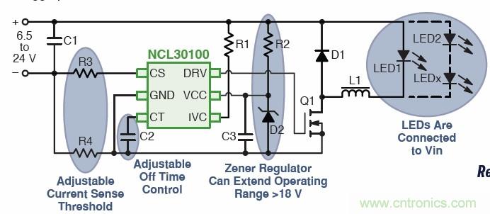 針對空間及高能效要求的低功率應用,安森美半導體提供一款能效高達95%,又具有自然LED開路保護的固定關閉時間降壓LED驅動器控制器NCL30100。該器件采用準固定關閉時間、峰值電流遲滯控制方法,不要求補償元件;其低邊N-FET開關拓撲適合連續(xù)導電模式工作,無須輸出電容;其工作頻率小于500 kHz,±5%典型穩(wěn)流容限,VCC工作電壓范圍為6.35至18 V。