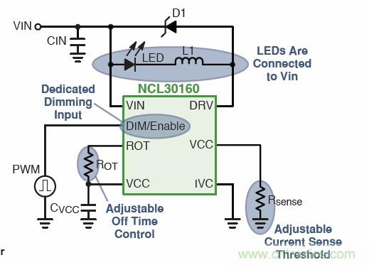 大功率LED可采用安森美半導體的恒流降壓LED驅動器NCL30160,實現高達98%的能效。它采用30 mΩ集成MOSFET,100%占空比可提供高能效;輸入電壓范圍為6.3 V至40 V,開關頻率可達1.4 MHz;還具有專用PWM調光引腳/低功率關閉、無須控制環(huán)路補償和1.5 A平均電流能力。