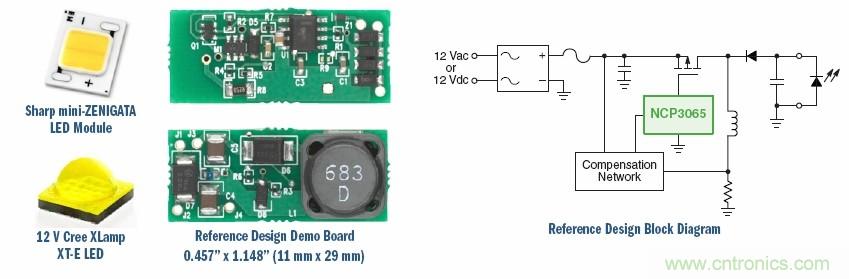 對于3至4個LED模塊的12 V AC-DC設計,可以使用安森美半導體針對NCP3065的評估板NCP3065BBGEVB,用來驅動12 Vac/Vdc應用中的夏普ZENIGATA™、Cree XLamp™MC-E及其他LED模塊。其特點是小尺寸、寬輸入和輸出工作電壓,輸出電流經過穩(wěn)流,還具有LED開路保護、輸出短路保護能力。該解決方案適用于MR16燈泡、景觀照明、交通照明。