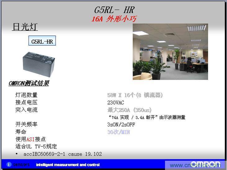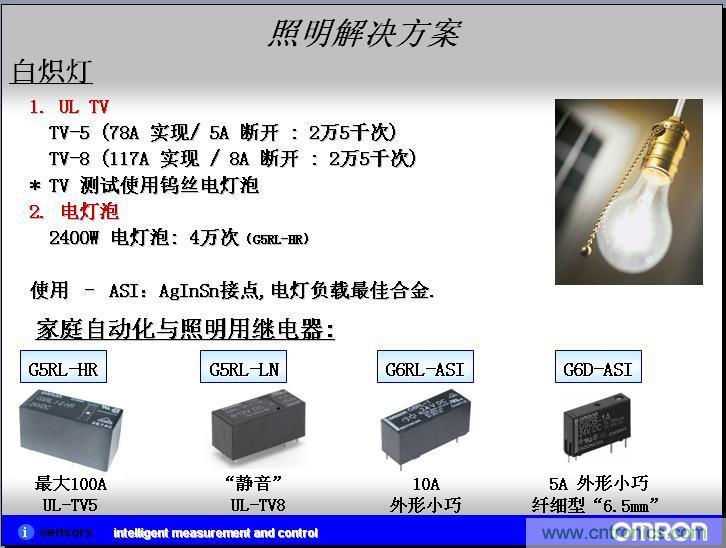 我們實(shí)際客戶應(yīng)用的案例,我們?cè)谕茝V客戶的過(guò)程中,形成了一些實(shí)際的應(yīng)用案例,在實(shí)現(xiàn)照明系統(tǒng)和家電自動(dòng)化的領(lǐng)域,在節(jié)能領(lǐng)域、自動(dòng)化的領(lǐng)域現(xiàn)在是越來(lái)越高了,目前歐姆龍的繼電器在日光燈這塊直接的應(yīng)用可以運(yùn)用繼電器作為啟用的電阻。繼電器也就是高級(jí)一點(diǎn)的器開關(guān)。在模塊上面,也是用來(lái)控制鎮(zhèn)流器的。在另外一個(gè)人體、物體探照這塊,我們也會(huì)有MEMS非接觸系統(tǒng)的微溫度傳感器。按照設(shè)計(jì)的過(guò)程中,就是在信號(hào)繼電器和MEMS非接觸溫度傳感器繼電器上都有應(yīng)用,但是還沒有成功案例,所以上面就打了問號(hào)。