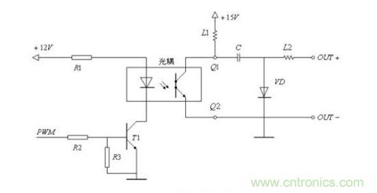 PWM.控制電路由光電耦合器和一個Cuk電路[3]組成。在此控制電路中,光電耦合器能夠有效抑制接地回路的噪聲,消除地干擾,提高了整個系統(tǒng)的抗干擾能力;光電耦合器把輸入端(單片機AT89C51)和輸出端(半導(dǎo)體制冷片TEC)電氣隔離,避免了主控芯片AT89C51受到意外傷害,有效保護了單片機AT89C51.另外,此控制電路中還利用光電耦合器組成了開關(guān)電路,節(jié)省了開關(guān)器件的使用。Cuk直流斬波電路的功能是將+15V的外接電源轉(zhuǎn)變?yōu)榭烧{(diào)電壓的直流電,即Cuk電路輸出端的電壓(半導(dǎo)體制冷片TEC的工作電壓)是可調(diào)的。輸出端OUT+和OUT-之間的可調(diào)電壓是受Q1端和Q2之間的關(guān)斷頻率控制的。在此控制電路中選用Cuk電路,因為Cuk斬波電路有一個明顯的優(yōu)點,即其輸入電源電流和輸出負載電流都是連續(xù)的,且脈動很小,有利于保證半導(dǎo)體制冷片TEC處于良好的工作狀態(tài)。
