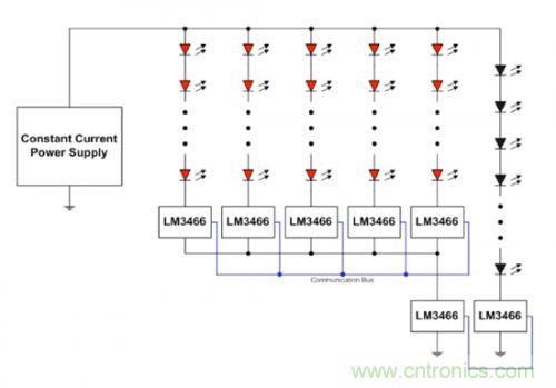 在本應(yīng)用中,LM3466 集成電路可互相通信,確保恒定電流電源所強(qiáng)加的輸入電流能夠在各串之間進(jìn)行平均分配。線性穩(wěn)壓器會(huì)吸收 LED 堆棧正向電壓的任何差異。