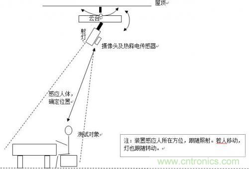 模型設(shè)計(jì)為,在一個(gè)房間的天花板處安裝此系統(tǒng),當(dāng)一個(gè)人進(jìn)入房間時(shí),系統(tǒng)可以自動(dòng)識(shí)別有人進(jìn)入房間,led射燈打開(kāi)并照亮人所在位置(及其周邊一定區(qū)域);當(dāng)人在房間里移動(dòng)時(shí),位于系統(tǒng)云臺(tái)上射燈發(fā)射的燈光會(huì)跟隨人體運(yùn)動(dòng)。