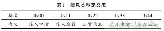 以容量為10人的紫外光語音通信系統(tǒng)為例說明數(shù)據(jù)幀結構的設計??紤]到通常情況下人講話的語速為每分鐘160~180個漢字,在保留一定余量的情況下,假設每分鐘240個漢字,如果壓縮后的語音信號速率為4.8Kb/s,可以算出平均每個漢字時間內的比特數(shù)為1200b。據(jù)此設計的數(shù)據(jù)幀結構如圖3所示,其中數(shù)據(jù)的信息速率為60Kb/s,信息體長度為1200b,時隙頭長度為96b。時隙頭包括前導序列、信息類型、發(fā)送方代號和接收方代號,長度分別為72b,8b,8b和8b。每一個用戶只處理接收代號和自己的代號一致的時隙。收發(fā)雙方作為一個組合占用相鄰的兩個時隙。前導序列為0,1交替的序列,信息類型的定義如表1所示。