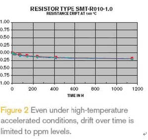 圖2 是表面貼裝電阻的典型長(zhǎng)期穩(wěn)定性曲線,可以看出在140°C下老化1000小時(shí)后阻值只有大約 0.2%的輕微漂移,這是由于生產(chǎn)過(guò)程中輕微變形而導(dǎo)致的晶格缺損造成的。阻值漂移很大程度上由高溫決定,因此在較低的溫度下比如+100°C,這種漂移實(shí)際是檢測(cè)不出來(lái)的。