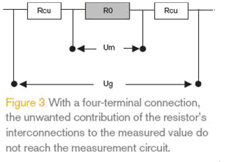 在低阻值電阻中,端子的阻值和溫度系數(shù)的影響往往是不能忽略的,實(shí)際設(shè)計(jì)中應(yīng)充分考慮這些因素,可以使用附加的取樣端子直接測(cè)量金屬材料兩端的電壓。如圖3所示,一個(gè)四端子的連接將允許測(cè)量系統(tǒng)實(shí)際用到的阻值為R0,而普通的連接的阻值為R0+2xRCu 。例如,10 mm長(zhǎng)0.3 mm線徑的銅線會(huì)增加2.4 mΩ的RCu阻值,4mm長(zhǎng)0.2mm寬 35 μm厚度的PCB引線的RCu阻值是10 mΩ