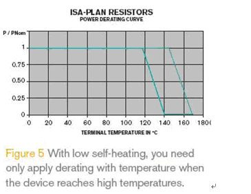 這種結(jié)構(gòu)的電阻可以在非常高的溫度下滿負(fù)荷工作,如圖5所示在很高的溫度下才出現(xiàn)功率折減;同時(shí),電阻材料的溫度可以維持在較低水平,這就可以有效改善電阻的長(zhǎng)期穩(wěn)定性和因溫度而引起的阻值變化。