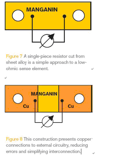 四引線設(shè)計(jì)推薦用于大電流和低阻值應(yīng)用。通常的做法使用錳鎳銅合金帶直接沖壓成電阻器(圖7),但這不是最好的辦法。盡管四引線電阻有利于改進(jìn)溫度特性和熱電壓,但總阻值有時(shí)高出實(shí)際阻值2到3倍,這會(huì)導(dǎo)致難以接受的功率損耗和溫升。此外,電阻材料很難通過(guò)螺絲或焊接與銅連接,也會(huì)增加接觸電阻以及造成更大的損耗。