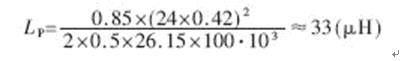 設PWM控制最大占空比Dmax=42%,如果初級繞組的電感量設計得大,則流過功率開關管和輸出濾波電容的電流峰值小,但由于電流上升斜率小,電路抗干擾能力差且功率開關管開通電流大;電感量小時,電流脈動大,沖擊電流大。因此設計電感電流工作在連續(xù)工作狀態(tài),輕負載時取額定功率的一半,由(2)式可知: