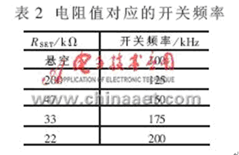 開關頻率可以通過外接電阻RSET在100kHz~200kHz之間調(diào)整,這個特點可以讓使用者根據(jù)工作頻率優(yōu)化磁存儲器以及電容器的尺寸、型號等。表2為不同的電阻值對應的常用開關頻率。