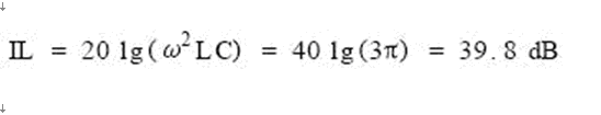 對于小功率的電子設備而言,LmaxCy,max的值通常為100μHμF,這是一個非常小的數(shù)值。以單級LC濾波器為例,為簡化分析,用電壓衰減來代替插入損耗,可得此時插入損耗為:
