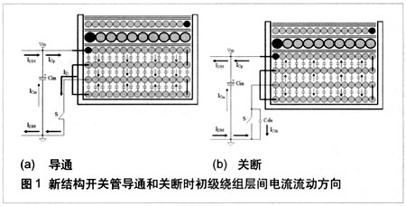 如果對變壓器的結構進行改進,如圖1所示,通過補償?shù)姆绞娇梢詼p小差模電流。注意:初級繞組的熱點應該埋在變壓器的最內(nèi)層,外層的繞組起到屏蔽的作用。同樣,基于電壓的變化方向,可以得到初級繞組層間電容的電流方向,由圖1所示可以看到,部分層間電流由于方向相反可以相互抵消,從而得到補償。