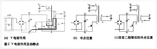 共模電流在輸入及輸出線與大地間流動,主要有下面幾部分:通過MOSFET源級到大地的電容Cde。如果改進IC的設計,如對于單芯片電源芯片,將MOSFET源極連接到芯片基極,用于散熱,而不是用漏極進行散熱,這樣可以減小漏極對大地的寄生電容。PCB布線時減小漏極區(qū)銅皮的面積可減小漏極對大地的寄生電容,但要注意保證芯片的溫度滿足設計的要求;通過Cm 和Cme產(chǎn)生共模電流;通過Ca和 Cme產(chǎn)生共模電流;通過Ct和Coe產(chǎn)生共模電流;通過Cs和Coe產(chǎn)生共模電流,這部分在共模電流中占主導作用。減小漏極電壓的變化幅值及變化率可減小共模電流,如降低反射電壓,加大漏-源極電容,但這樣會使MOSFET承受大的電流應力,其溫度將增加,同時加大漏-源極電容,產(chǎn)生更強的磁場。如果系統(tǒng)加了Y電容,如圖2所示,通過Cs的大部分共模電流被Y 電容旁路,返回到初級的地,因為Y電容的值大于Coe。Y電容必須直接并用盡量短的直線連接到初級和次級的冷點。如果導通時MOSFET的dV/dt大于關斷時的值,Y電容則連接到初級的地,反之連接到Vin。