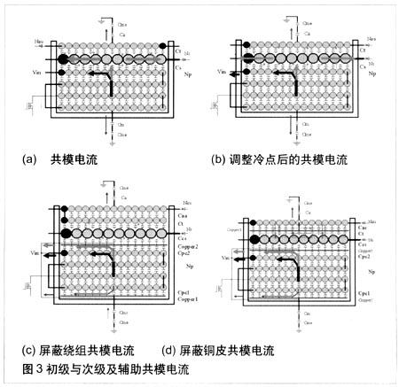 如果在內(nèi)層及初級、次級繞組間放置銅皮,銅皮的寬度小于或等于初級繞組的寬度,銅皮的中點由導線連到冷點,如圖3(c)所示,由于銅皮為冷點,與其接觸的繞組和銅皮間電壓的擺率降低,從而減小共模電流,同時將共模電流由銅皮旁路引入到冷點。注意銅皮的搭接處不能短路,用絕緣膠帶隔開,內(nèi)外層銅皮的方向要一致。輔助繞組和次級繞組的共模電流可以由以下方法補償:① 加輔助屏蔽繞組:輔助屏蔽繞組繞制方向與次級繞組保持一致,輔助屏蔽繞組與次級繞組的同名端連接到一起,并連接到冷點,輔助屏蔽繞組的另一端浮空。由于它們的電壓變化的方向相同,所以兩者間沒有電流流動。②加外層的輔助屏蔽銅皮:輔助屏蔽銅皮的中點連接到輔助繞組的中點。同樣,基于電壓的變化方向分析電流的方向,可以看到,兩者之間的電流形成環(huán)流,相互補償?shù)窒?,從而降低共模電流?br />