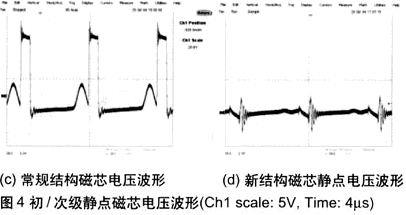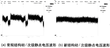 測量變壓器初級和次級靜點的電壓波形及變壓器磁芯的電壓波形,可以為EMI的傳導測試提供一些參考(見圖4)。常規(guī)結構變壓器的初級和次級靜點電壓波形的幅值為10V,并且可以明顯地看到基于開關頻率的開關波形。新結構變壓器的初級和次級靜點電壓波形的幅值為5V,基于開關頻率的開關波形不是很明顯。常規(guī)結構的變壓器的磁芯電壓波形的幅值為18V,可以明顯地看到基于開關頻率的開關波形。新結構的變壓器的磁芯電壓波形的幅值為5V,基于開關頻率的開關波形不是很明顯。