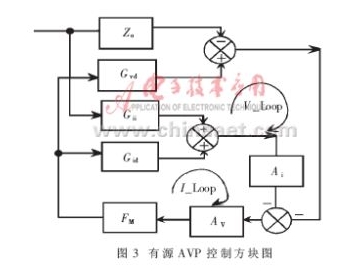 AVP有源控制為雙環(huán)控制,其基本原理如圖2所示。通過檢測電感電流,根據(jù)降壓要求相應(yīng)調(diào)節(jié)輸出電壓的基準(zhǔn)。輸出電壓跟隨基準(zhǔn)電壓而實現(xiàn)AVP控制。圖3為AVP有源控制的方塊圖,假設(shè)電流環(huán)增益為Ti,電壓環(huán)增益為Tv,則: