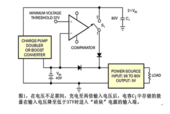 應(yīng)記住,電容存儲(chǔ)的能量以指數(shù)增加,而電容的電壓線性增加。倍增器把C1充電至兩倍輸入電壓或至少為80V。即便假定每10s出現(xiàn)一次5ms電壓不足,用于充電200mF的電流仍僅約為3mA。比較器觀察輸入電壓,并且一旦它降至低于37V,開關(guān)S1就會(huì)關(guān)閉,而來自C1的能量向“磚塊”電源放電。