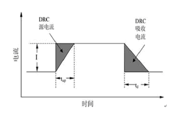 假定DRC電路遠遠快于變換器,則DRC的工作時間取決于DC/DC變換器的電流改變速率Sr,并可分為不同的電流上升速率(Sru)及下降速率(Srd)?,F(xiàn)在,我們研究一個負載電流脈沖期間