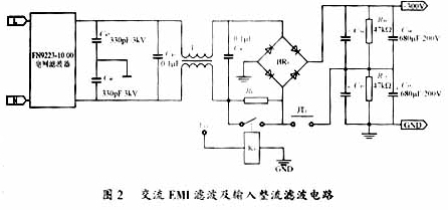 交流輸入220V時,整流采用橋式整流電路。如果將JTI跳線短連時,則適用于110V交流輸入電壓。由于輸入電壓高,電容器容量大,因此在接通電網(wǎng)瞬間會產(chǎn)生很大的浪涌沖擊電流,一般浪涌電流值為穩(wěn)態(tài)電流的數(shù)十倍。這可能造成整流橋和輸入保險絲的損壞,也可能造成高頻變壓器磁芯飽和損壞功率器件,造成高壓電解電容使用壽命降低等。所以在整流橋前加入由電阻R1和繼電器K1組成的輸入軟啟動電路。