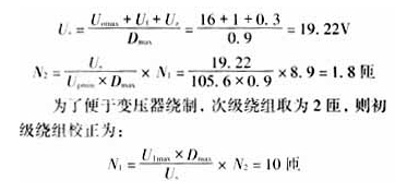 計算原副邊繞組匝數(shù):按輸入電壓最低及輸出滿載的情況(此時占空比最大)來計算原副邊繞組匝數(shù),已知Umin=176V經(jīng)整流濾波后直流輸入電壓Udmin=1.2×176=211.2V。