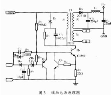 輔助電源采用RCC變換器(RingingChokeConverter),見圖3。其輸入電壓為交流220V整流濾波電壓,輸出直流電壓為12.5V,輸出直流電流為0.5A。電路中Q8和變壓器初級繞組線圈N1與反饋繞組線圈N3構(gòu)成自激振蕩。R72為啟動電阻。Q9、R77構(gòu)成輔助電源初級過流保護。D20、C81、ZD1、Q11、R75、R76構(gòu)成電壓檢測與穩(wěn)壓電路,控制Q8的基極電流的直流分量,從而保持輸出電壓恒定,變壓器采用EE19、LP3材質(zhì)構(gòu)成。初級180匝,反饋繞組5.5匝,次級11匝,初級電感量是2.6mH,磁芯中間留有間隙0.4mm。