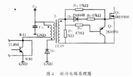 驅(qū)動電路如圖4所示。TL494輸出50kHz的脈沖信號,通過高頻脈沖變壓器耦合去驅(qū)動功率MOS管。次級脈沖電壓為正時,MOS管導(dǎo)通,在此期間Q7截止,由其構(gòu)成的泄放電路不工作。當(dāng)次級脈沖電壓為零時,則Q7導(dǎo)通,快速泄放MOS管柵級電荷,加速MOS管截止。R70是用于抑制驅(qū)動脈沖的尖峰,R68、D15、R67可以加速驅(qū)動并防止驅(qū)動脈沖產(chǎn)生振蕩。D17和與它相連的脈沖變壓器繞組共同構(gòu)成去磁電路。