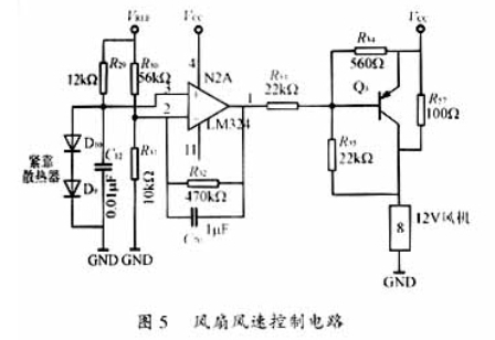 風(fēng)扇風(fēng)速控制電路見圖5。利用二極管正向管壓降隨溫度升高而呈下降趨勢的特性,將D9、D10做為散熱器溫度采樣器件。方法是將D9、D10兩二極管緊靠在散熱器上,當(dāng)散熱器隨輸出功率加大而溫度升高時,運放N2A正相輸入端電平降低,輸出低電平使三極管Q3開始導(dǎo)通,風(fēng)機上電壓升高,轉(zhuǎn)速升高,最終到達最高轉(zhuǎn)速。當(dāng)負載較輕,使散熱器溫度低于50℃時,N2A輸出高電平,Q3不導(dǎo)通,輔助電源12.5V經(jīng)電阻R57降壓給風(fēng)機供電,風(fēng)機處于低速、低噪聲運行狀態(tài)。此電路可以提高風(fēng)機工作壽命,增加電路可靠性,亦可在小負載情況下,減少風(fēng)機帶來的噪聲。