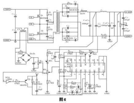 控制電路采用通用脈寬調(diào)制器TL494,具有通用性和成本低等優(yōu)點,見圖6。輸出電壓經(jīng)R40、RV2、RV1、R41進行分壓采樣,經(jīng)R5阻抗匹配后送到TL494腳1。RV1裝在電源前面板上用于實現(xiàn)輸出電壓的調(diào)節(jié)。R103和C14將輸出電感L1前信號采樣,經(jīng)R5送到TL494腳1,用于提高電源穩(wěn)定度,消除L1對環(huán)路穩(wěn)定性影響。