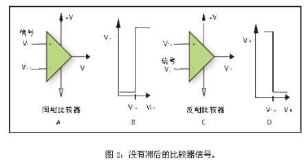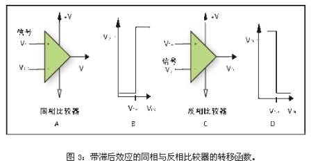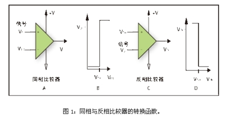 圖1B和1D給出了比較器電路的轉換函數(shù)。同相比較器被定義為在輸入信號大于門限電壓時輸出為正的比較器,而反相比較器被定義為輸入信號大于門限電壓時輸出為負的比較器。