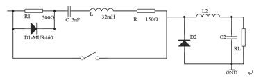 在開(kāi)關(guān)控制電源的輸入部分加入緩沖電路(見(jiàn)圖3),其由線性阻抗穩(wěn)定網(wǎng)絡(luò)組成,用于消除電力線干擾、電快速瞬變、電涌、電壓高低變化和電力線諧波等潛在的干擾。緩沖電路器件參數(shù)為D1為MUR460,R1=500Ω,C=6nF,L=36mH,R=150Ω。