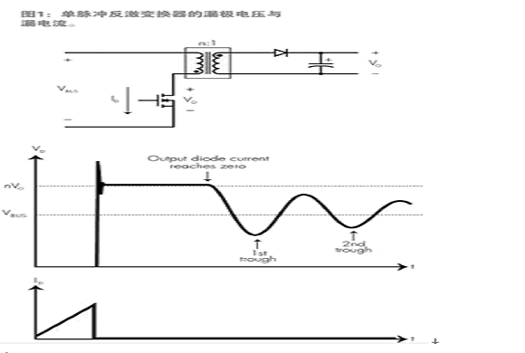 圖1說明了在非連續(xù)導(dǎo)通模式下工作的電流模式反激變換器的漏極波形,這里只施加了一個門脈沖。在第一個時間間隔,漏電流上升,直到達(dá)到所需的電流強(qiáng)度,此時電源開關(guān)關(guān)閉,回轉(zhuǎn)變壓器中的漏電感與節(jié)點電容形成諧振。這會導(dǎo)致漏電感浪涌,該浪涌受箝位電路限制,在電感浪涌消失后,漏極電壓返回到等于輸入電壓加上初級線圈感應(yīng)電壓的水平。如果忽略初級線圈電感和節(jié)點電容的影響,當(dāng)輸出二極管中的電流降到零時,漏極電壓立即降到總線電壓,但漏極電壓衰減到如圖1所示的水平。