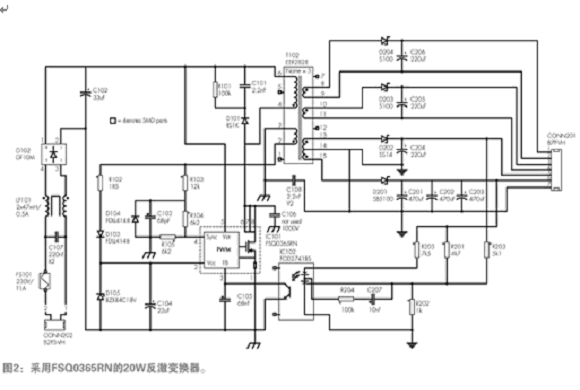 圖2說明了Fairchild全球電源資源中心德國的設(shè)計的示例應(yīng)用,R103-5、D104和C103為檢測最小漏極電壓所需的額外元件,F(xiàn)OD2741為誤差放大器,它在同一封裝中結(jié)合了標(biāo)準(zhǔn)光耦合器和工業(yè)標(biāo)準(zhǔn)的431參考,其它元件為反激變換器的標(biāo)準(zhǔn)部分。