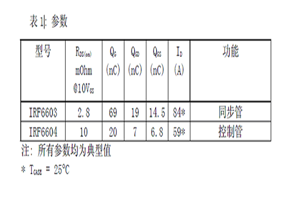 此設計可以高效輸出超過100A(>25A/相)的電流而面積只有95mm×31mm(3.8inch X 1.25inch )。每項均使用一個控制管和一個同步管的DirectFET MOSFET。用作控制管和同步管的30V DirectFET的規(guī)格見表1。請注意它們高的載流能力省去了器件并聯(lián)的需要。