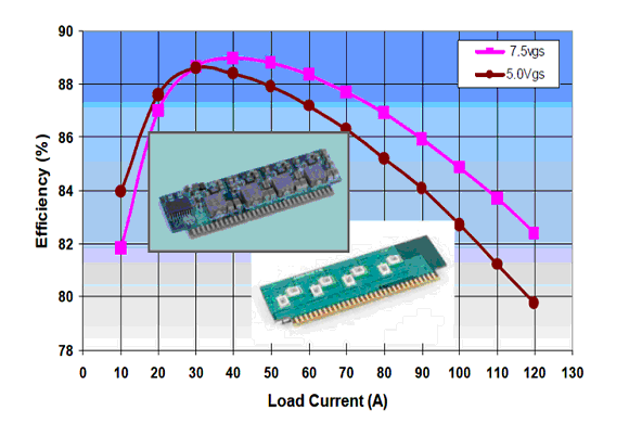 VRM線路板被重新設計,用4Oz厚覆銅,進一步減小PCB走線電阻,改善熱性能。圖2所示為這款4Oz厚覆銅板的VRM,在500KHz工作頻率,12V輸入電壓,1.7V輸出電壓,600LFM風冷的條件下的效率曲線。在一個很寬的負載電流范圍內,7.5V柵驅動電壓表現(xiàn)出更高的效率。此款VRM在最大負載電流120A時,效率達到82%。