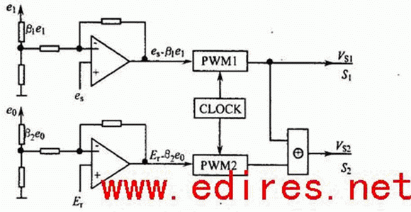 es = i1Rs 壓降,與β1e1 經(jīng)加減運算電路后得es-β1e1 并送入PWM 1控制器。 其輸出Vs1作為開關(guān)管S1 的驅(qū)動信號,S1的導通時間為Ton1。它采用的是前饋控制,目的是把e1 和i1的擾動所引起的系統(tǒng)瞬態(tài)誤差減到最小,以改善系統(tǒng)的瞬態(tài)響應。