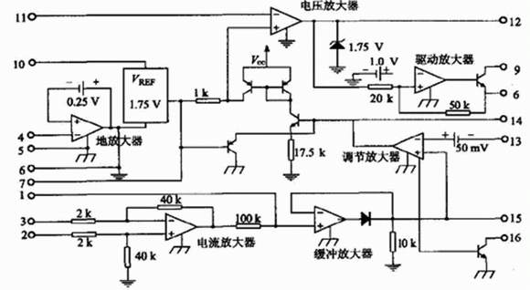 UC3907的內(nèi)部結(jié)構(gòu)如圖1所示??煞譃殡妷涵h(huán)與電流環(huán)(包括均流控制) 兩部分。其中電壓環(huán)由電壓放大器、接地放大器和驅(qū)動放大器構(gòu)成。電流環(huán)由電流放大器、緩沖放大器、調(diào)節(jié)放大器和狀態(tài)指示構(gòu)成。