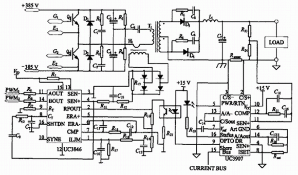因?yàn)殡娫床⒙?lián)在一起, 很難達(dá)到輸出電流分配均勻, 所以并聯(lián)電源模塊間必須采用均流措施。某DC/DC變換器要求: 輸入電壓為385V, 輸出電壓38V, 輸出電流為100A, 必要時多臺開關(guān)穩(wěn)壓電源可以直接并聯(lián)使用, 并聯(lián)使用時的負(fù)載不均衡度小于5%。DC/DC變換器主電路采用半橋式電路拓?fù)?控制芯片采用TI公司生產(chǎn)的電流控制型PWM集成控制芯片UC3846, 在比較幾種均流控制方案的基礎(chǔ)上, 選擇了根據(jù)最大電流自動均流法而設(shè)計(jì)的UC3907 均流控制芯片, 實(shí)現(xiàn)了并聯(lián)運(yùn)行時均流控制。電源模塊在并聯(lián)時, 取得較好的均流效果。