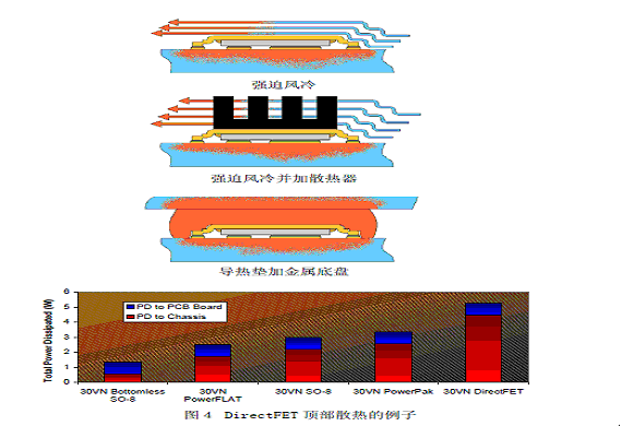DirectFET封裝的頂部金屬漏極連接為芯片的結(jié)和頂部封裝之間提供了一條較低的熱阻抗路徑使結(jié)到殼的熱阻只有3°C/W 。這就使得器件的散熱方法與以往有很大不同,可以用強迫風冷或?qū)岬奶畛浣橘|(zhì)將熱傳到一個適當接地的散熱器上。圖4舉例說明了這些概念。