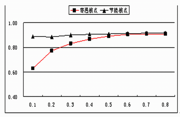 針對(duì)電源部分的損耗,戶外電源的工作模式和室內(nèi)電源是一樣的,正常情況下為均流工作模式。市電正常時(shí)模塊負(fù)載率較低,電源系統(tǒng)大多數(shù)沒有工作在系統(tǒng)最佳效率區(qū)間,因此可以采用電源模塊休眠技術(shù)根據(jù)系統(tǒng)負(fù)載狀態(tài),動(dòng)態(tài)調(diào)整工作模塊數(shù)量,使系統(tǒng)始終工作在最佳效率區(qū)間,從而降低系統(tǒng)的能耗。圖1表示了電源系統(tǒng)在普通工作模式下和節(jié)能模式下的系統(tǒng)典型效率比較。從圖1可看出,采用休眠節(jié)能模式,電源系統(tǒng)的效率在整個(gè)負(fù)載范圍內(nèi)基本保持不變,有效的降低了電源系統(tǒng)在低負(fù)載條件下的能耗。另一方面,對(duì)于戶外電源來說,電源系統(tǒng)效率提高會(huì)降低設(shè)備倉(cāng)的發(fā)熱量,降低設(shè)備倉(cāng)的溫度。