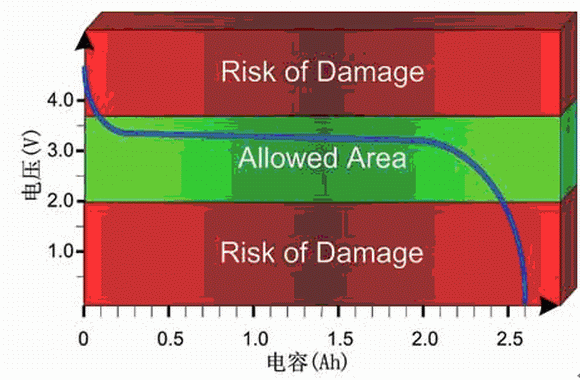 一旦電壓超出允許范圍,鋰電池很容易被損壞(見(jiàn)圖1)。如果超出電壓的上限和下限(例如,nanophosphate鋰電池的電壓上限和下限分別為3.6V和2V),電池就可能會(huì)受到不可逆的損壞,至少也會(huì)增加電池的自放電率。在相當(dāng)寬的荷電狀態(tài)范圍內(nèi),輸出電壓可以保持穩(wěn)定,因此正常情況下超出安全范圍的可能性比較小。但是,在接近安全范圍上限和下限的區(qū)域,變化曲線非常陡峭。作為預(yù)防措施,仔細(xì)監(jiān)測(cè)電壓水平非常必要。