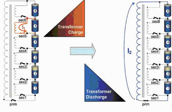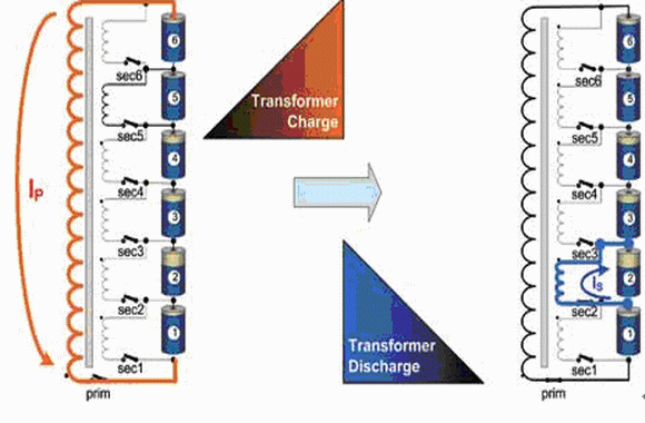 閉合主繞組開(kāi)關(guān),電池組向變壓器充電。然后斷開(kāi)主繞組開(kāi)關(guān),閉合相應(yīng)的次繞組開(kāi)關(guān)(本例中為2號(hào)次繞組開(kāi)關(guān)),變壓器儲(chǔ)存的能量轉(zhuǎn)移到指定的電池上。