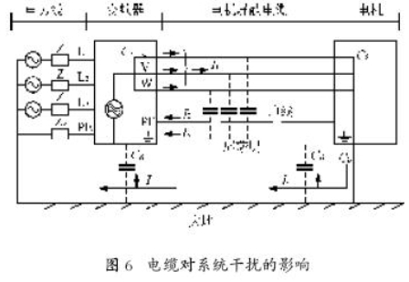 頻率范圍為150 kHz~30 MHz的電子干擾一般來自傳導(dǎo)。傳動系統(tǒng)中范圍為30 MHz~1 GHz 的空間輻射干擾產(chǎn)生于逆變器,電機(jī)電纜及電動機(jī)。由于電動機(jī)電壓較高的dv/dt 以及電機(jī)電纜上的容性電流產(chǎn)生了漏電流,而且使用屏蔽的電機(jī)電纜也會增加漏電流,如圖6所示。